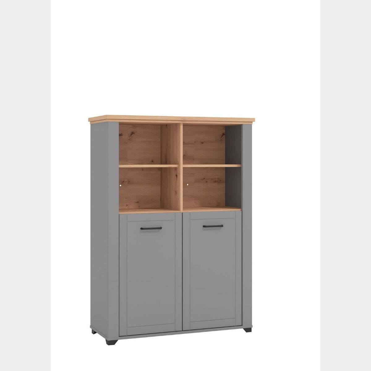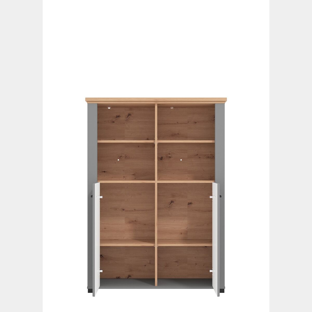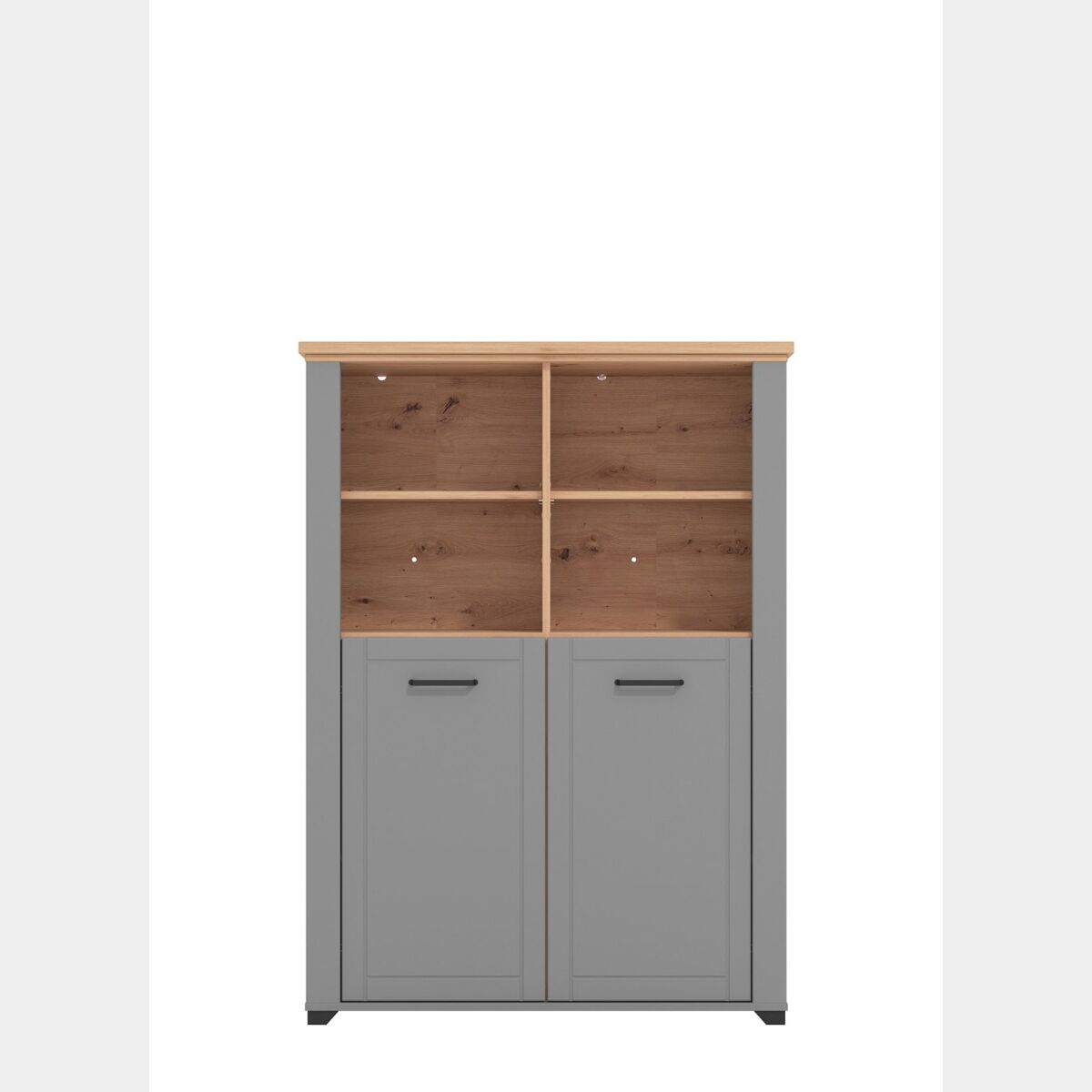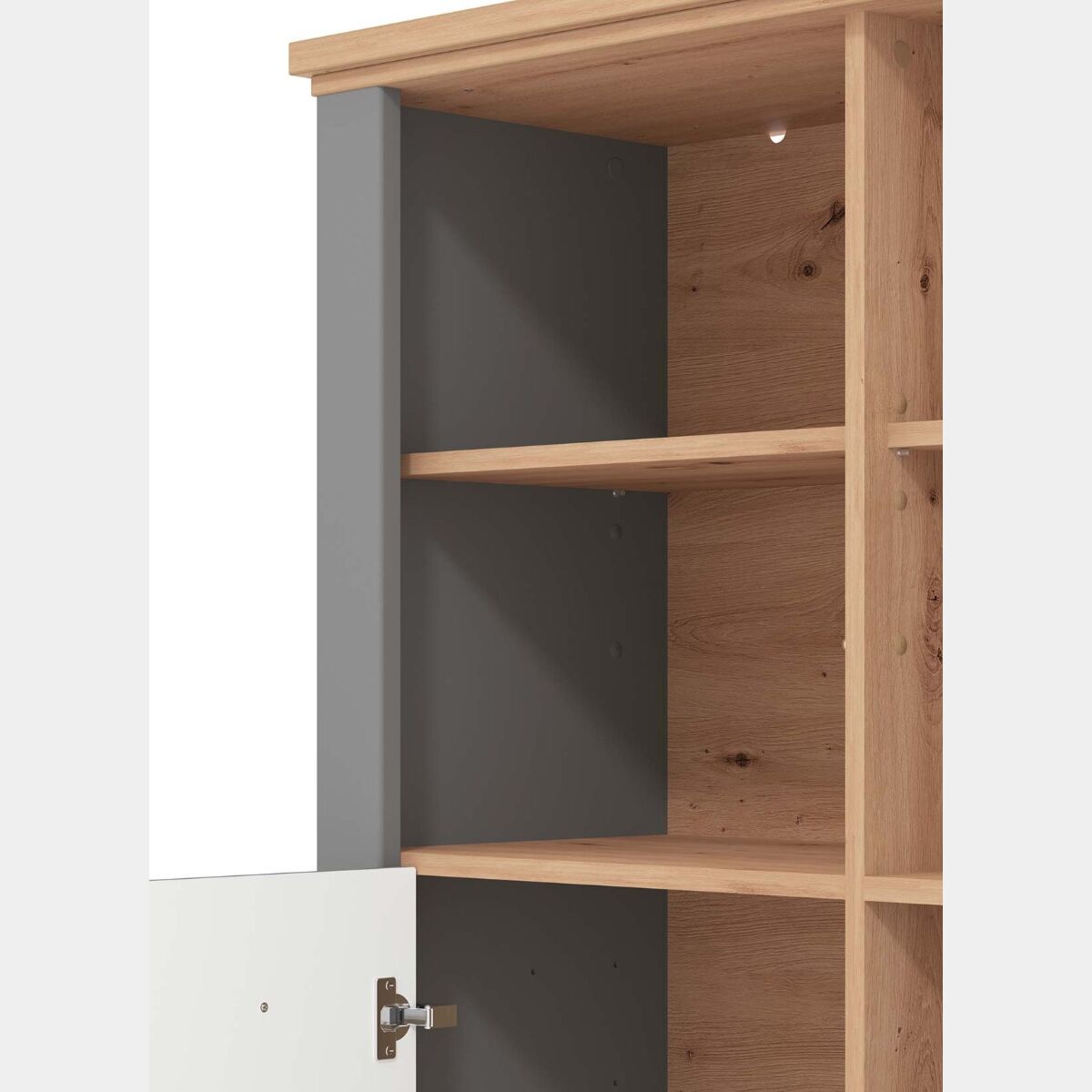 Linee decise caratterizzano la vetrina a due ante, assicurando eleganza e ricercatezza all'ambiente. Due sono le finiture che caratterizzano il mobile: la calda tonalità effetto legno, il Rovere, presente nel top, e l'intens o Grigio grafite. Il contrasto generato assicura un complemento d'arredo di forte impatto che viene valorizzato da sottili maniglie orizzontali nere.