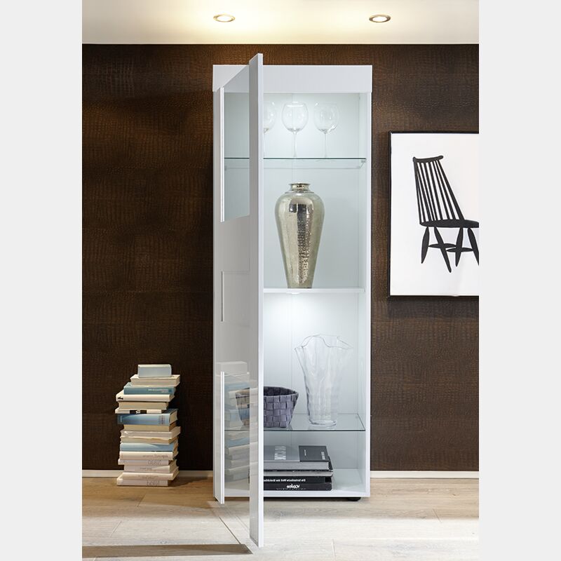 Vetrina ad un anta, lavorata con geometriche forme per creare un movimento sinuoso sul frontale, moderna e di design, linee pulite, ampie e robuste superfici, finitura bianco lucido laccato, sono le caratteristiche principali di questa vetrina non solo utile ma esteticamente sorprendete.