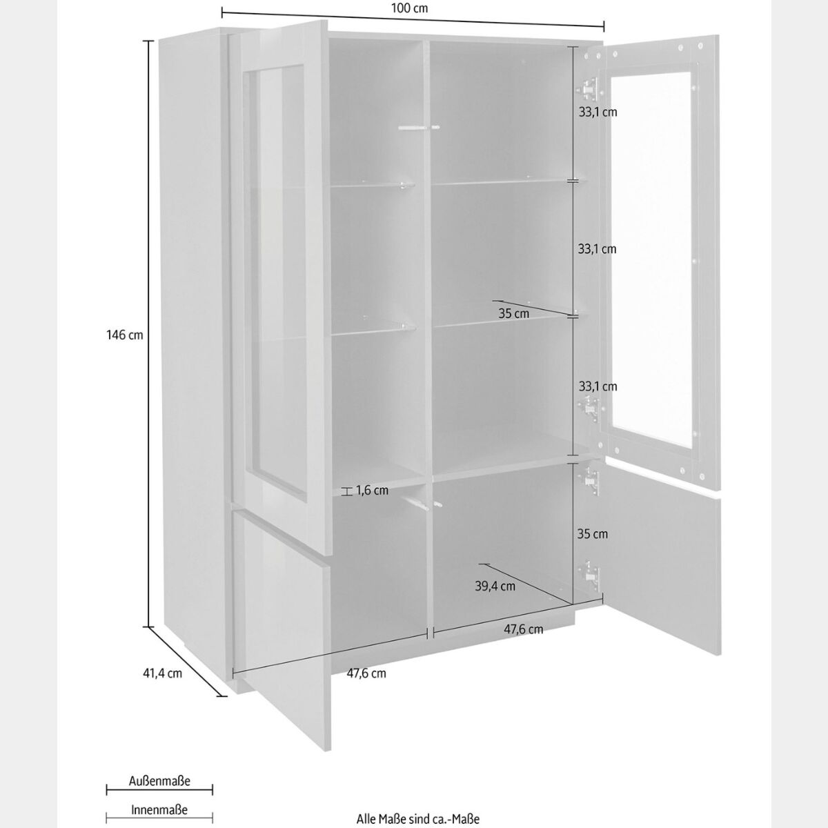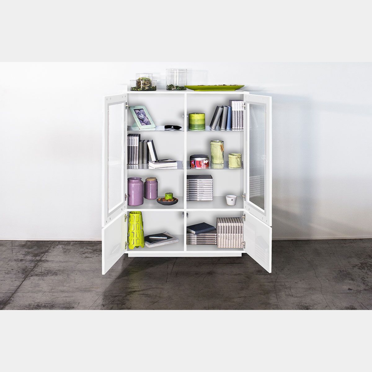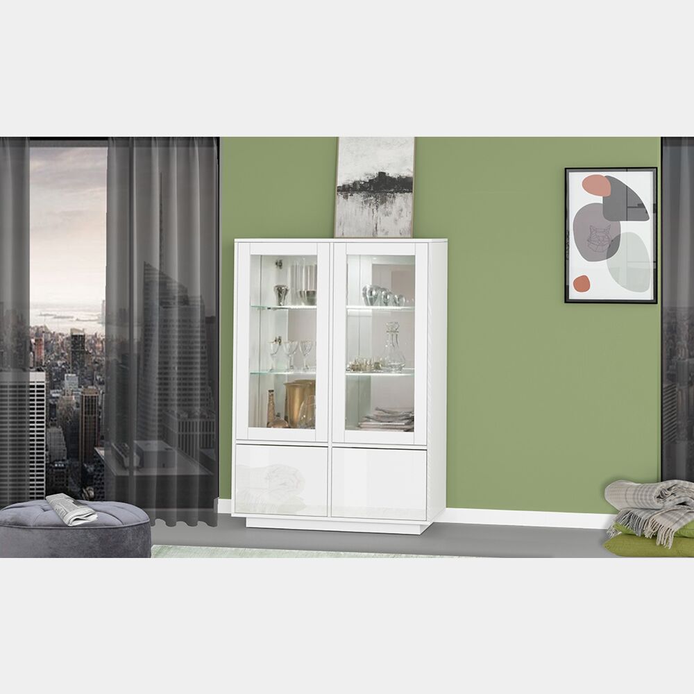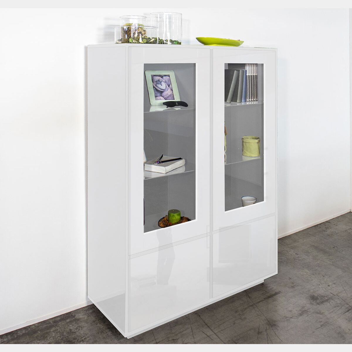 Vetrina di design a due ante battenti con dotato sistema di apertura push-pull, si presenta in finitura bianca laccata lucida sia nella struttura sia nella zona frontale. L'elemento è fortemente caratterizzato dalla linee sobrie e pulite che rendono questa vetrinetta un complemento per l'arredamento estremamente versatile ma nel contesto leggero e contemporaneo suggerita principalmente per arredare ambienti moderni ma non di meno classici grazie all'adattabilità del genere.