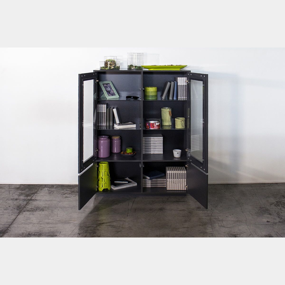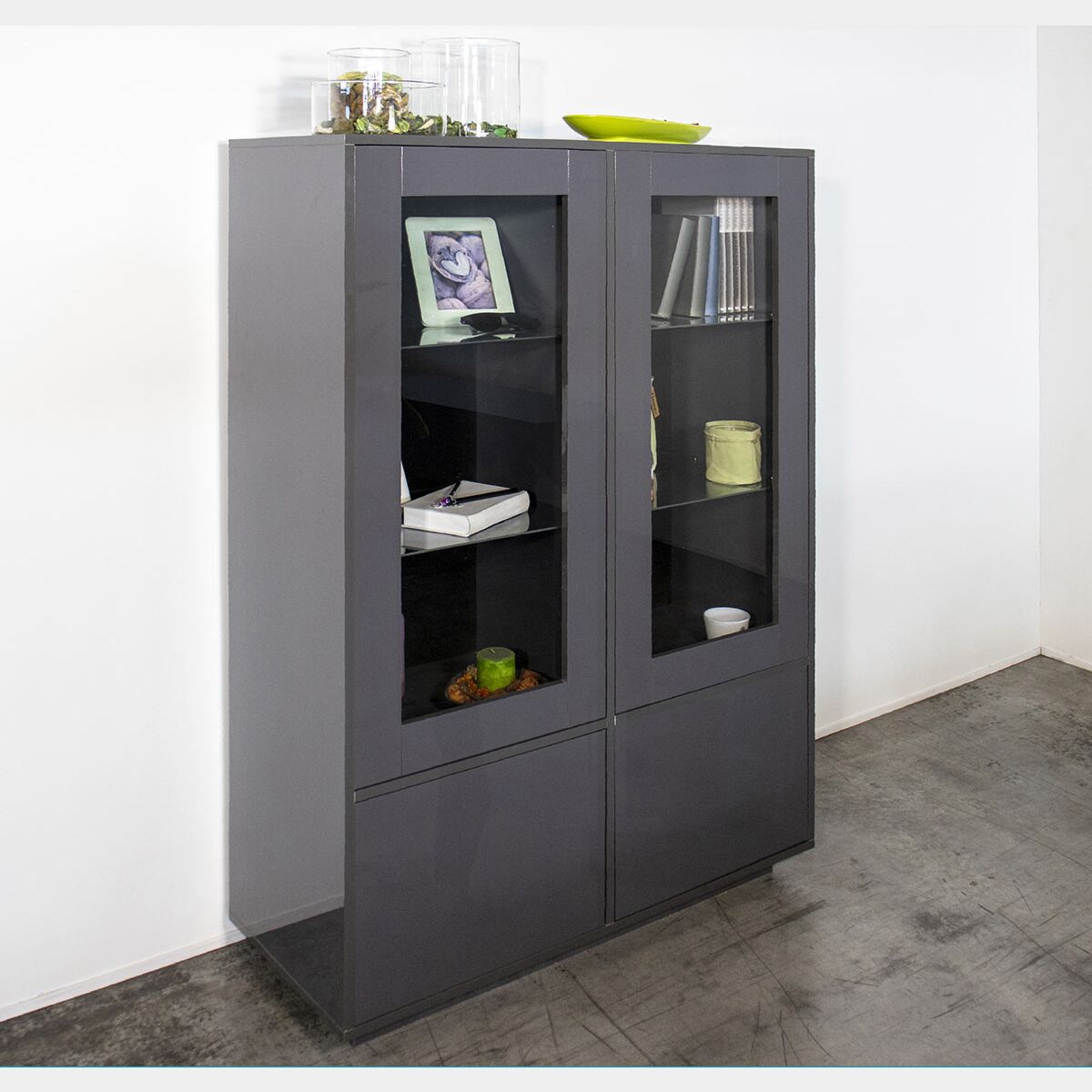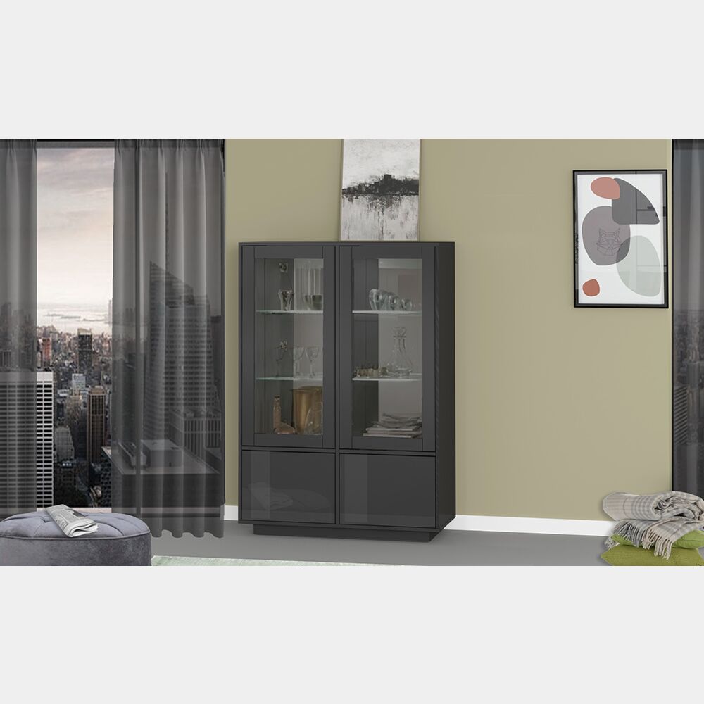 Vetrina di design in finitura antracite laccata lucida