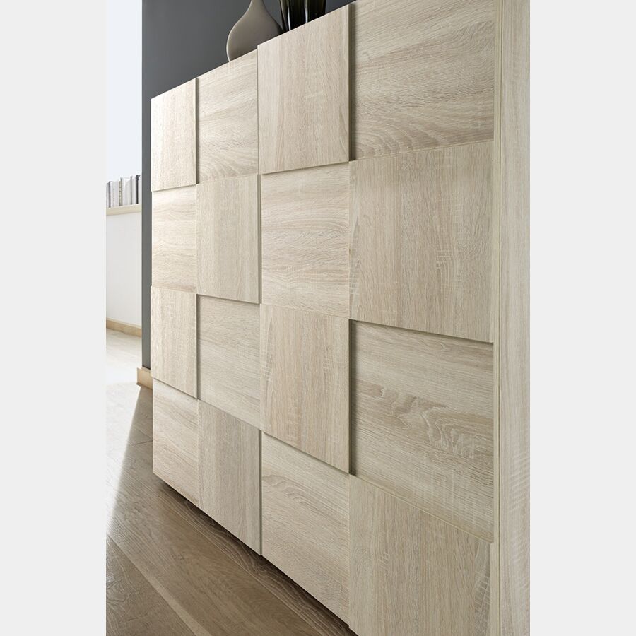 Vetrina a due ante, moderna e di design, linee pulite, ampie e robuste superfici, e in finitura Rovere Samoa, il frontale è lavorato con geometriche forme per creare un movimento sinuoso.