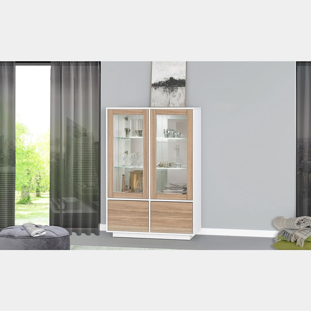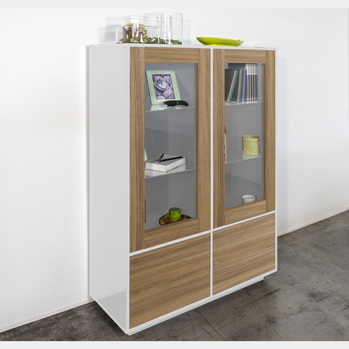 Vetrina bicolor a due ante battenti, si contraddistingue per il caloroso ed avvolgente color noce caracalla che si presenta nelle ante frontali, il quale viene a fondersi con la finitura bianca laccata lucida della struttura dando vita ad un elemento originale grazie all'accostamento di due colori contrapposti.
