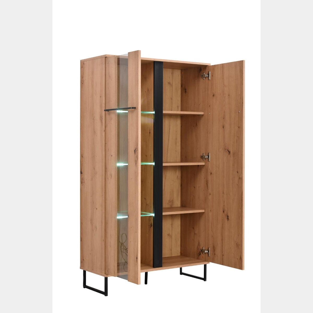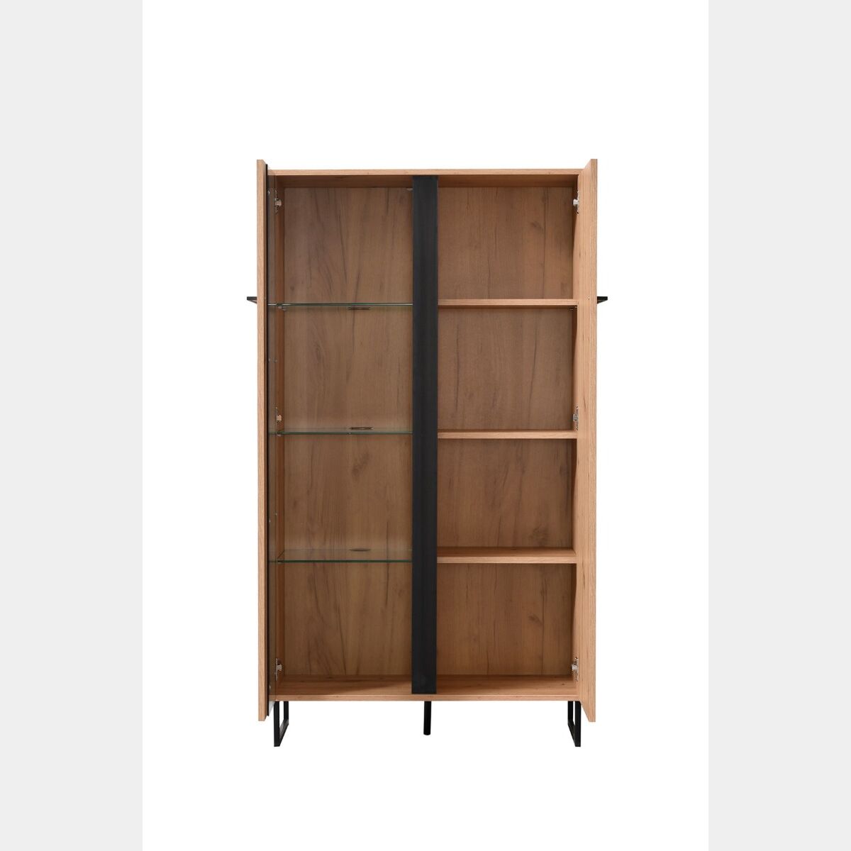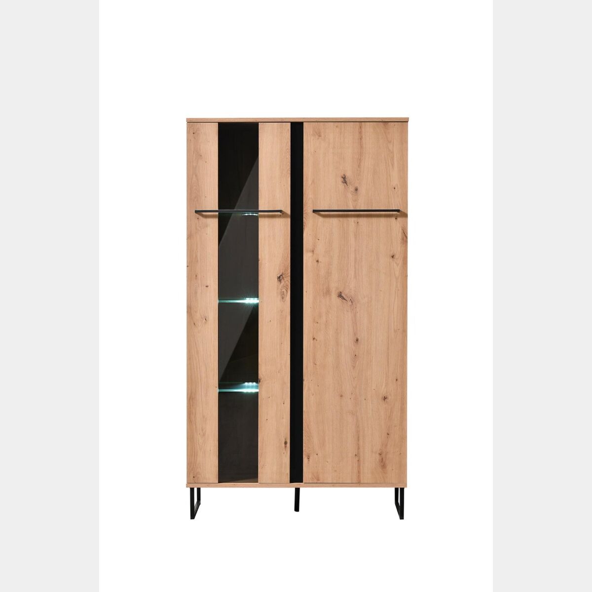 A caratterizzare lo stile della vetrina sono le lunghe e sottili maniglie, i tipici piedini e le due finiture a contrasto, caratteristiche che conferiscono alla vetrina il tipico stile industry.