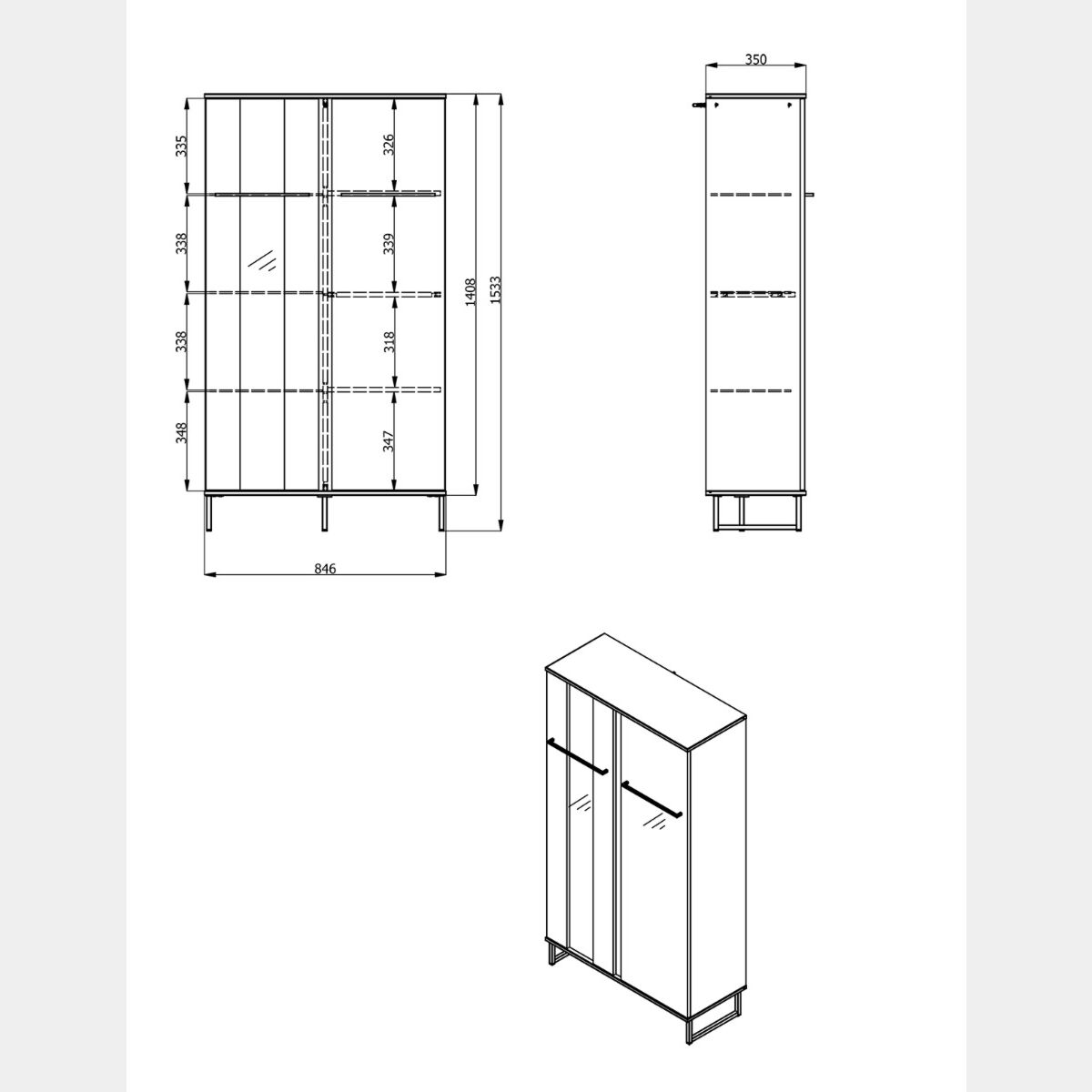 La vetrina presenta due ante, quella di sinistra ha un inserto verticale in vetro con tre ripiani interni, anch'essi in vetro. L'anta di destra invece presenta tre ripiani interni in legno, posti alla stessa altezza di quelli opposti. La suddivisione interna dell'armadio è stata progettata per conservare numerosi oggetti e lasciare in vista gli elementi che devono essere notati.