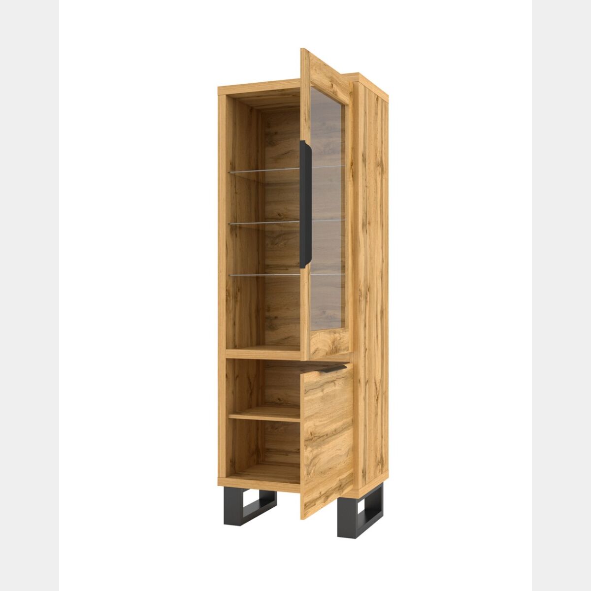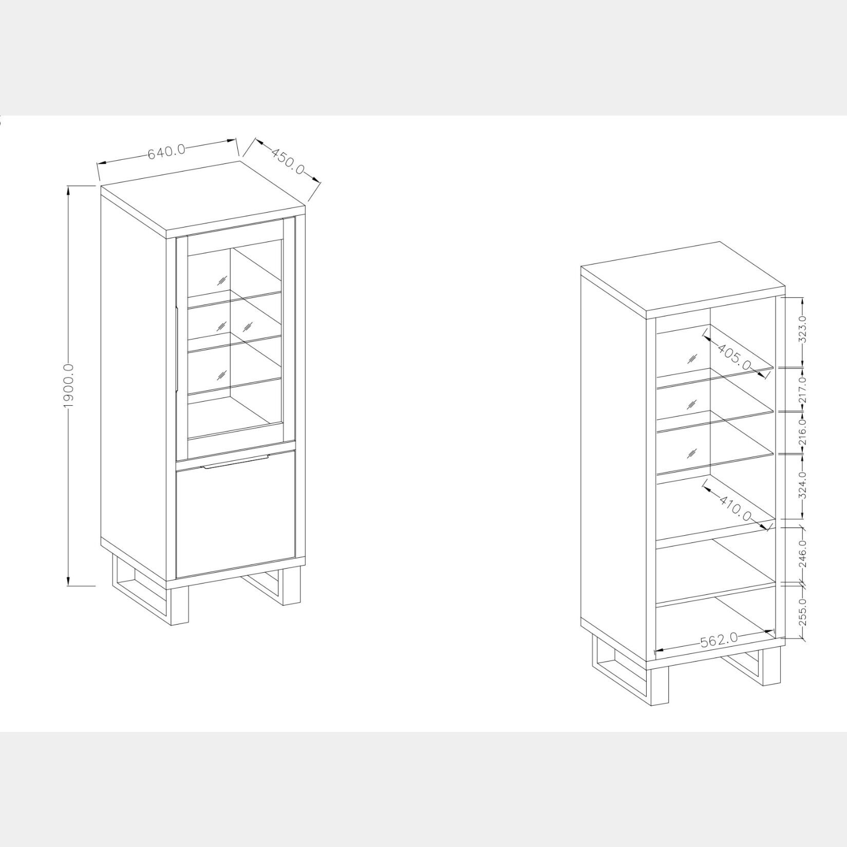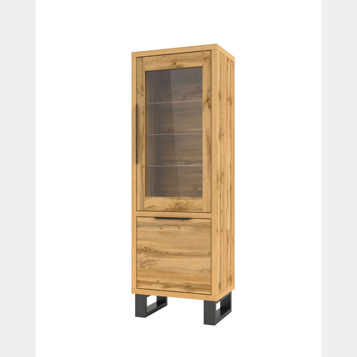 Vetrina-colonna moderna composta da 2 ante e 5 ripiani interni, colore quercia e metallo nero, è la soluzione ideale per gli appassionati di salotti industry. È un abbinamento di colori armonizzante caratterizzati dal legno naturale con una elegante finitura in metallo.