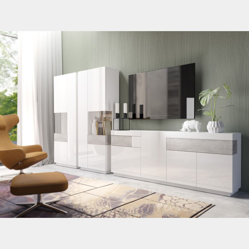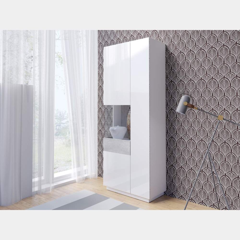 La vetrina colonna a 2 ante della collezione Cracovia propone uno stile estremamente moderno che combina alla perfezione il colore bianco e l'effetto grigio cemento. Dispone inoltre di un ampio spazio portaoggetti composto da 2 ante che racchiudono 8 ripiani interni.