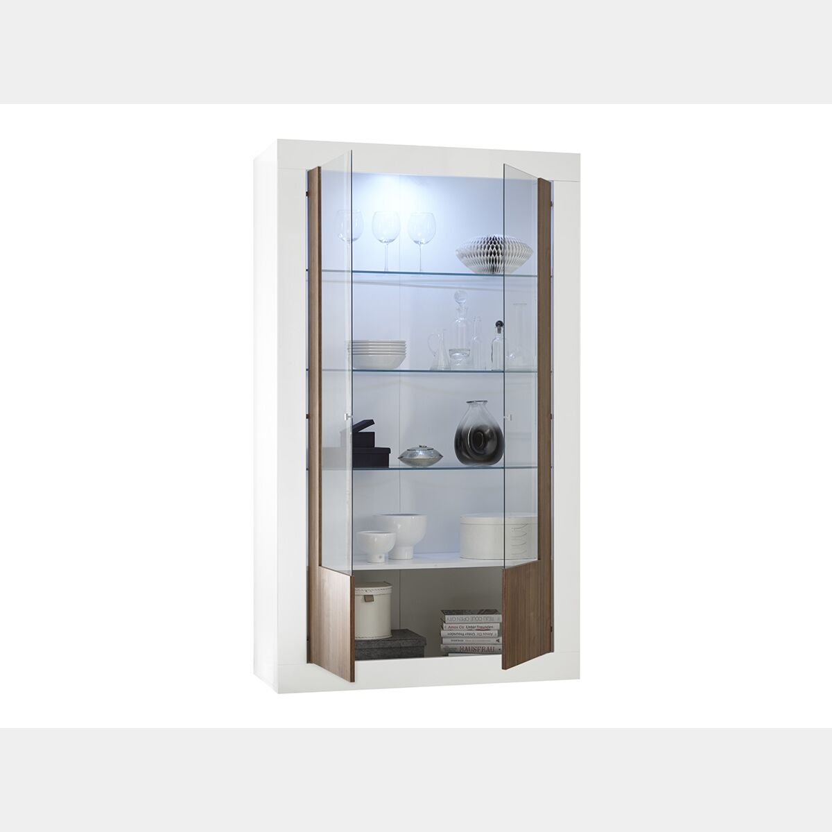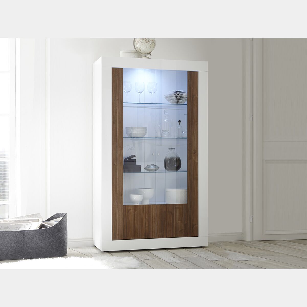 Vetrina moderna, 2 ante in vetro nella finitura Noce Dark e Bianco Laccato Lucido. La vetrina con 2 ante unisce l'eleganza del design italiano e il fascino moderno offrendo così un risultato estremamente chic e rendendo la vostra zona living di tendenza.