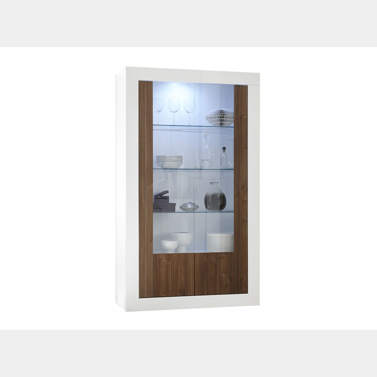 Vetrina moderna con 3 ripiani in vetro e 2 ante, finitura Bianca Lucida e Noce Dark