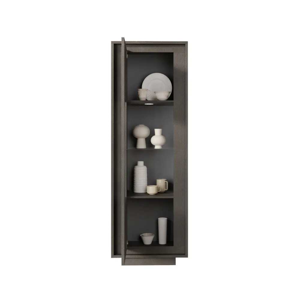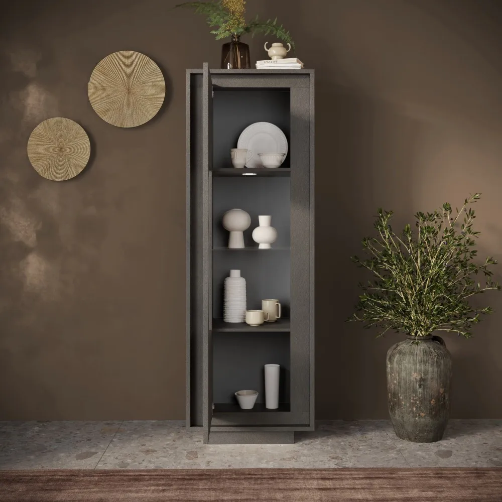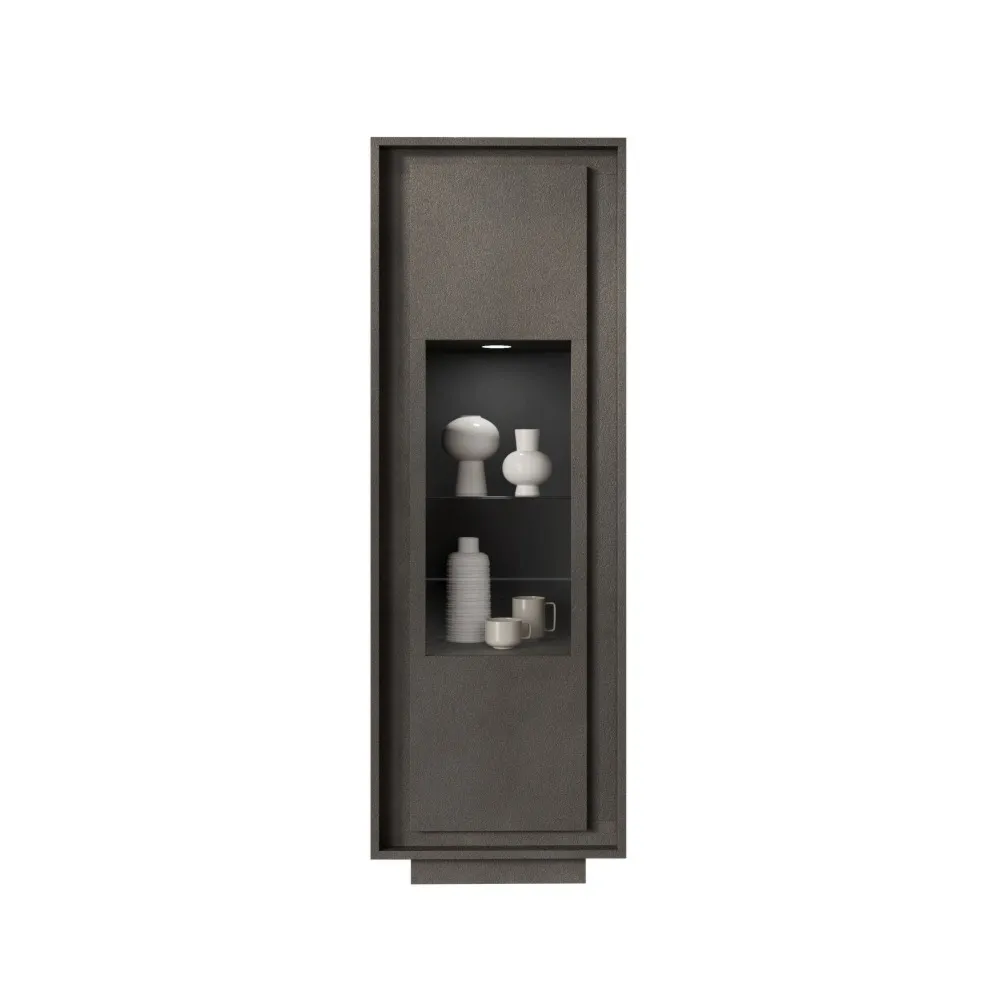 Ideale per ambienti moderni dalle tinte neutre la vetrina completa l'arredo di ogni living, offrendo un arredo originale e di tendenza. La finitura Lava di struttura e frontali assicura una forte personalità al soggiorno; sono disponibili numerose altre tinte per adattare la vetrina ad ogni ambiente, tutte le finiture sono visualizzabili nella collezione Venus.
