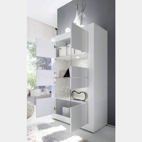 La struttura della vetrina è nella finitura Nero, le 4 ante battenti invece sono alternate dal Pero al vetro, per rendere la vetrina caratteristica e accattivante. Le piccole ma particolari maniglie danno un tocco minimal alla vetrina.