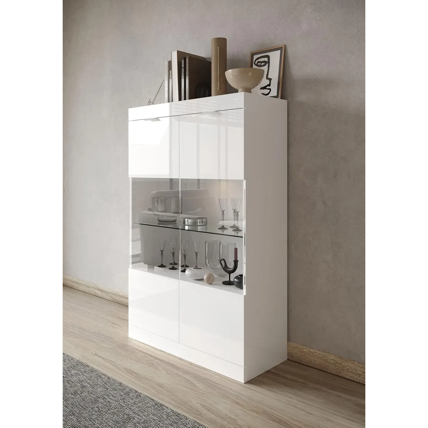 La finitura Bianco lucido contribuisce a conferire alla vetrina una linea pulita e ricercata, assicurando una perfetta adattabilità del mobile a tutti gli spazi moderni.