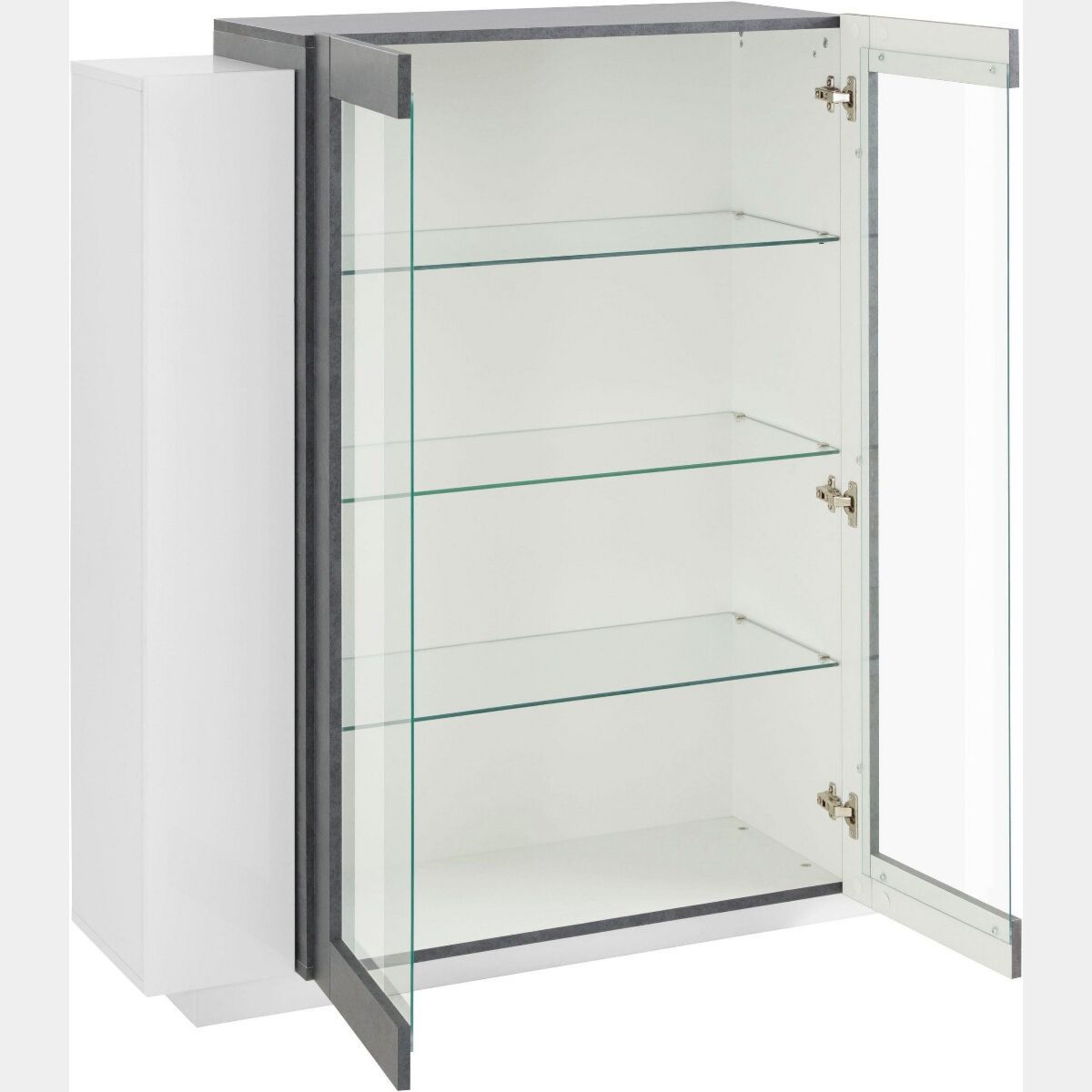 La vetrina è composta da 2 ante vetro contornate da un bordo in finitura Ardesia. All'interno sono presenti 3 ripiani in vetro, ciò consente alla vetrina di risultare molto capiente e spaziosa.