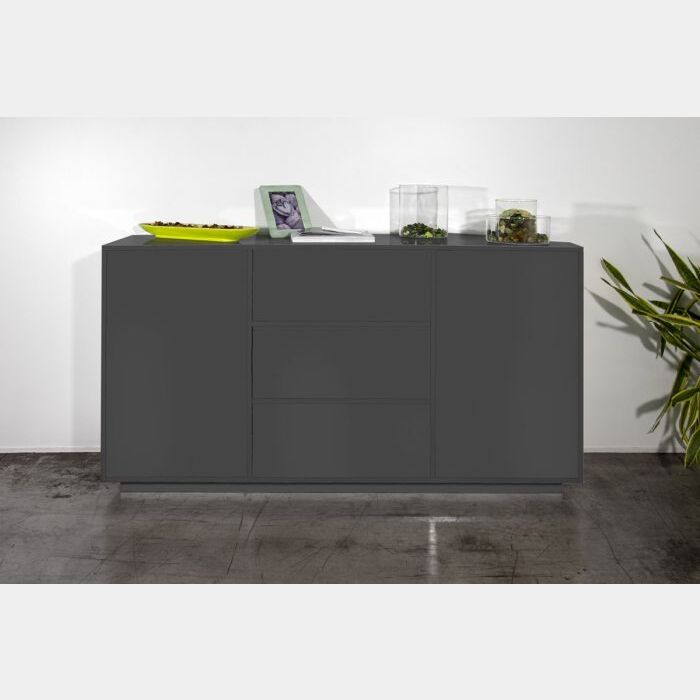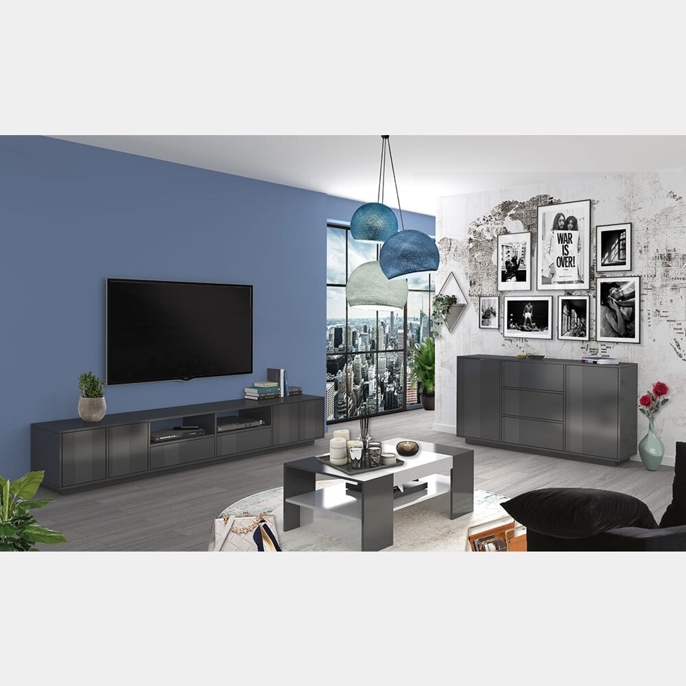 Zona giorno antracite lucido formata da madia 2 ante e 3 cassetti e spazioso porta TV