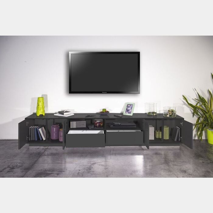 -Mobile porta tv in appoggio con due ante battenti e due cassetti in finitura antracite laccato lucido . Il mobile si declina in tre possibili colorazioni: bianco lucido, antracite lucido e bianco lucido abbinato a un nuovo colore.