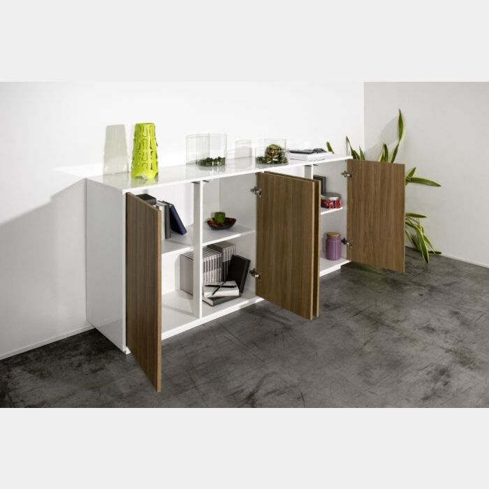 -La madia di design 4 ante finitura laccata bianca lucida e al noce caracalla è ideale per l'arricchimento di soggiorni moderni in virtù delle linee semplici e pulite che contraddistinguono la credenza. Ideale in soggiorni ampi dal gusto ricercato la madia diviene così un elemento aggiuntivo per dare valore ad una zona conviviale. La credenza viene valorizzata grazie alla presenza di uno zoccolo inferiore alla base che le conferisce un carattere estremamente minimal e dona all'arredamento un'importanza supplementare. Inoltre, per una disposizione interna utile, entrambe le ante laterali del complemento sono dotate di un ripiano centrale in legno, sul quale è possibile inserire un'ampia gamma di oggettistica di uso costante e sempre a portata di mano, proprio per questi importanti attributi si presta ad essere un mobilio pensato per offrire totale comodità.