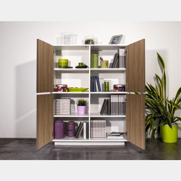Il contrasto delle due colorazioni che si fondono regalano una sensazione di contemporaneità accostata ad un confortevole contesto caloroso e genuino grazie alla tonalità del legno. La struttura presenta quattro ante battenti, le quali permettono una distribuzione dello spazio efficiente e pratica al 100%, sono presenti infatti diversi ripiani al suo interno, i quali forniscono il vantaggio di poter sfruttare lo spazzio al massimo delle possibilità. Struttura in finitura bianca lucida e ante in finitura noce caracalla, certificato FSC.