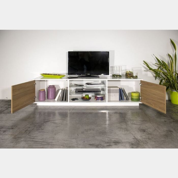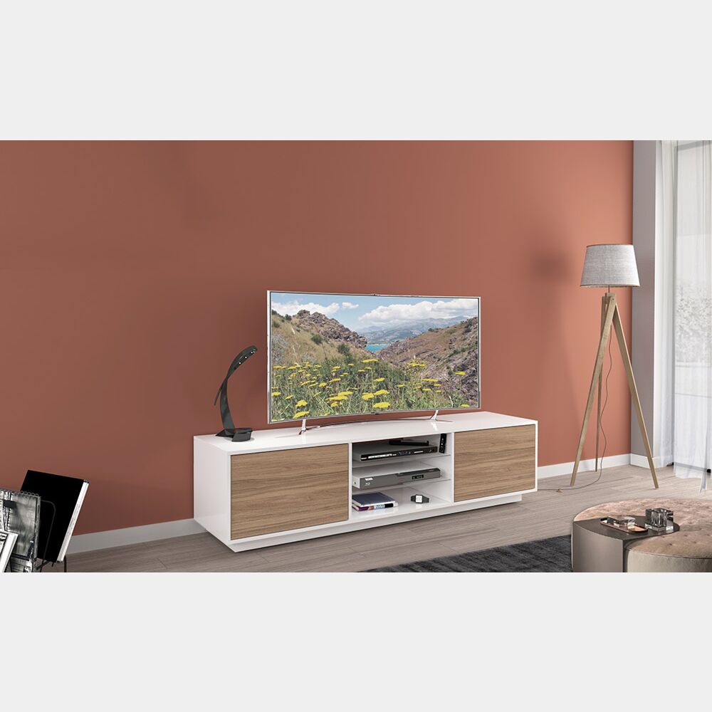 -Il porta tv moderno bicolor si distingue per la contrapposizione della finitura bianca laccata lucida, segno intramontabile dello stile moderno che si viene a fondere alla finitura noce caracalla, un'essenza che regala calore e armonia all'ambiente, ideale da inserire in soggiorni moderni e contemporanei nei toni caldi del legno o nei colori laccati abbinati alla raffinatezza del vetro, presente nei ripiani. Il complemento può essere abbinato alla madia della stessa collezione per creare un soggiorno coerente e in linea.
