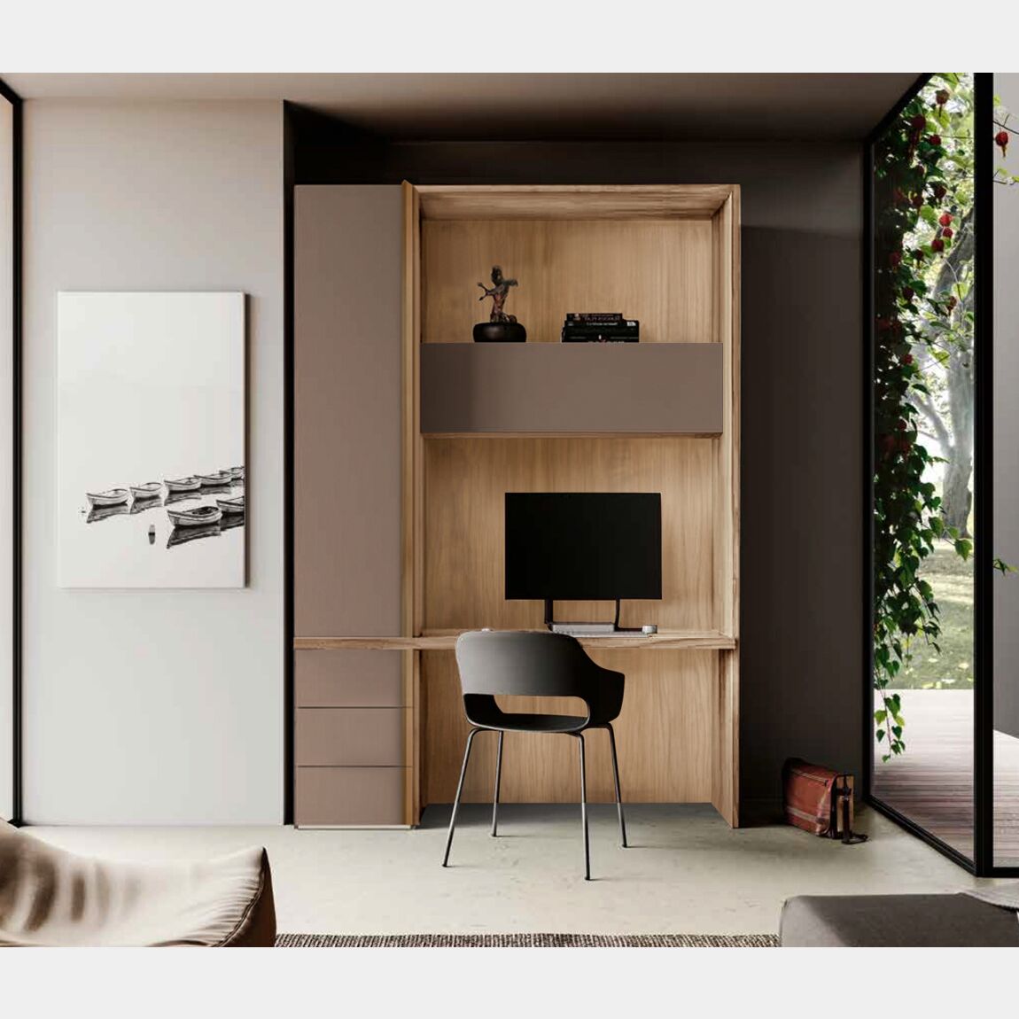 Proproniamo la zona studio per Smart Working in 2 delicate finiture: Noce Biondo e Bronzo. La loro fusione genera armonia ed eleganza, caratteristiche che consentono una perfetta adattabilità a tutti gli ambienti, in particolare a quelli più caldi e luminosi.