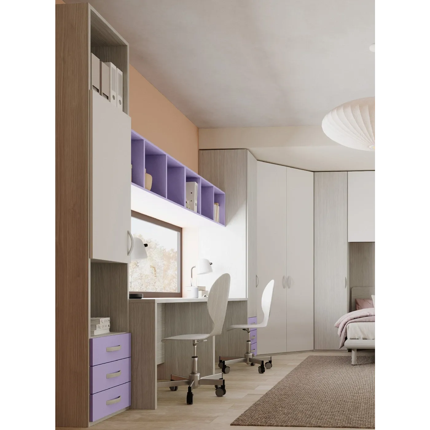 Zona studio con 2 scrivanie, libreria e pensili a giorno, Cenere wood, Bianco e Malva