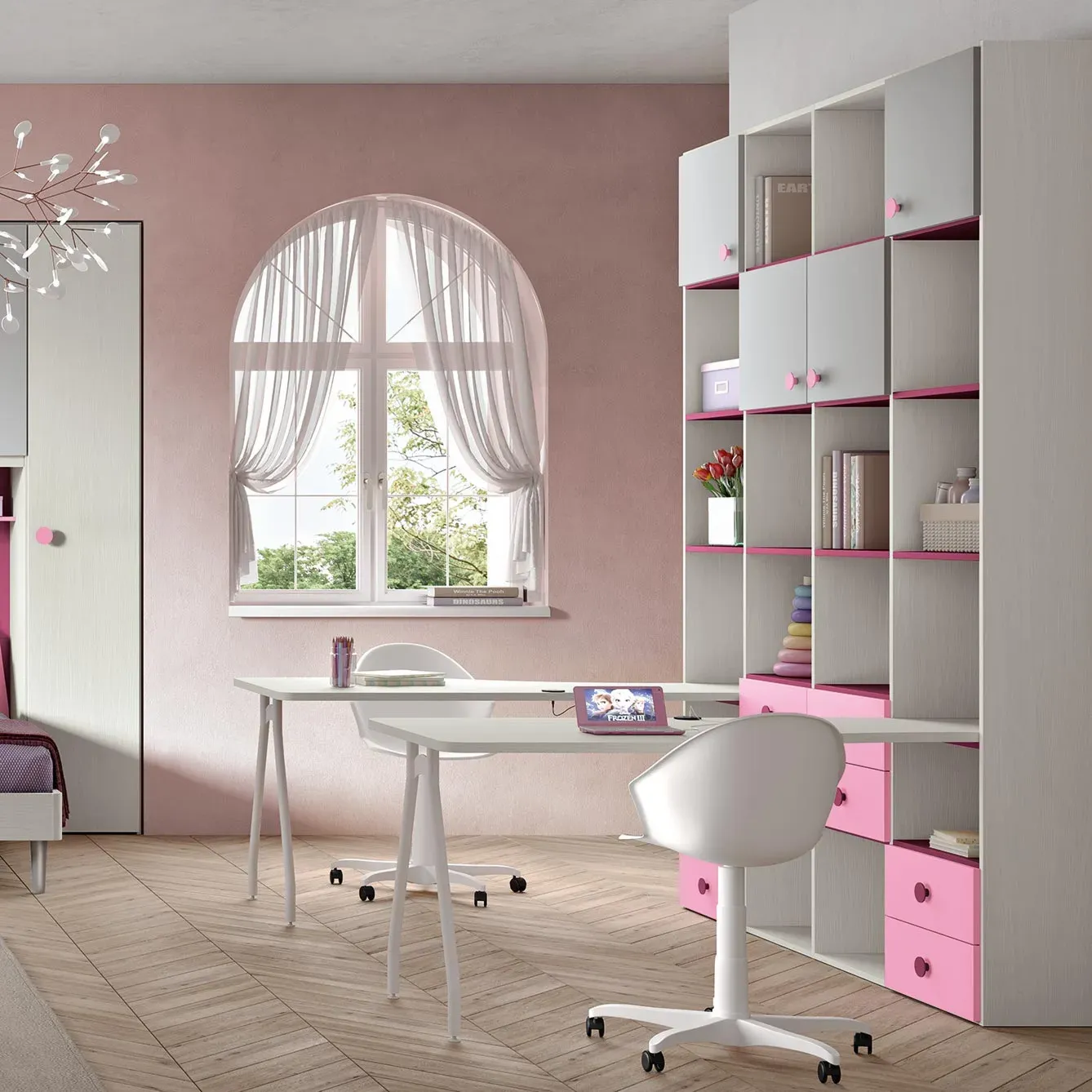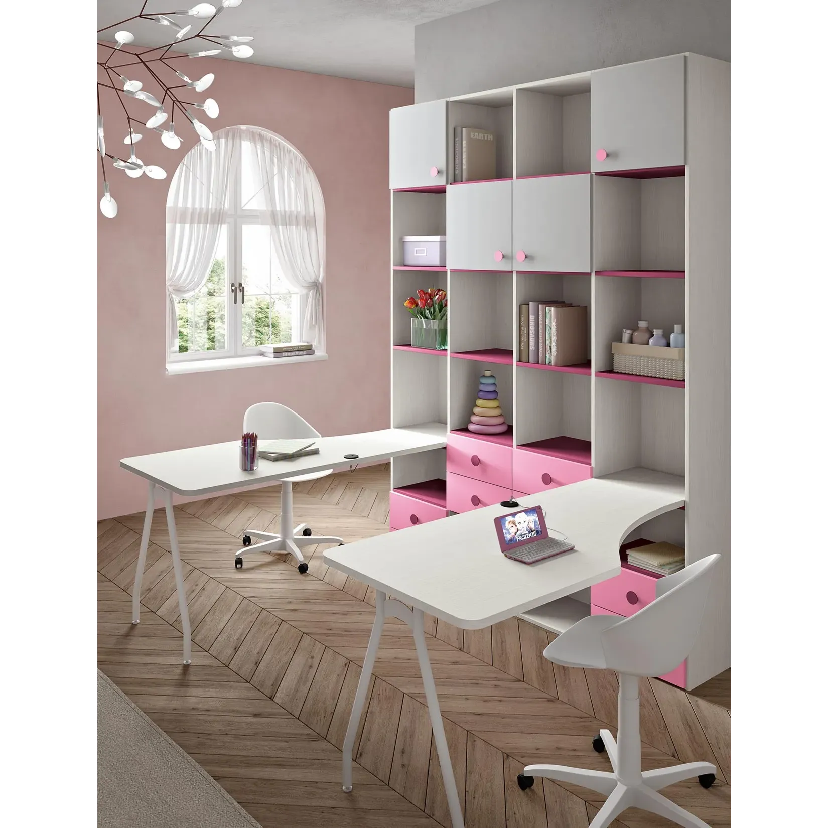 La zona studio ben si adatta a tutte le camerette, offrendo due valide postazioni per studiare in comodità. La capiente libreria, attrezzata con ante e cassetti, offre un ampio piano per riporre libri, quaderni e tutto il materiale necessario.