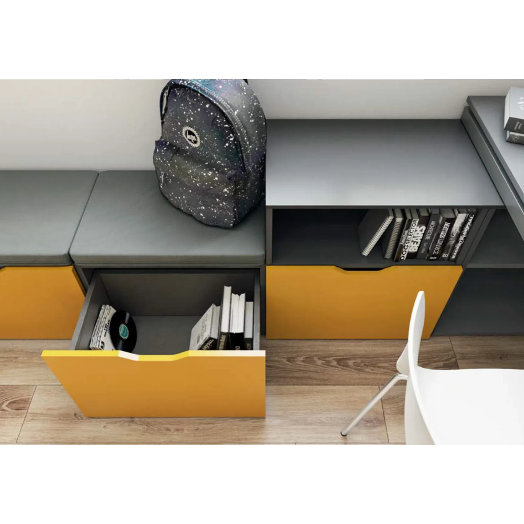 Zona studio con tre cestoni e vani a giorno, finiture Antracite e Ocra, personalizzabili. Vedi tutta la collezione qui