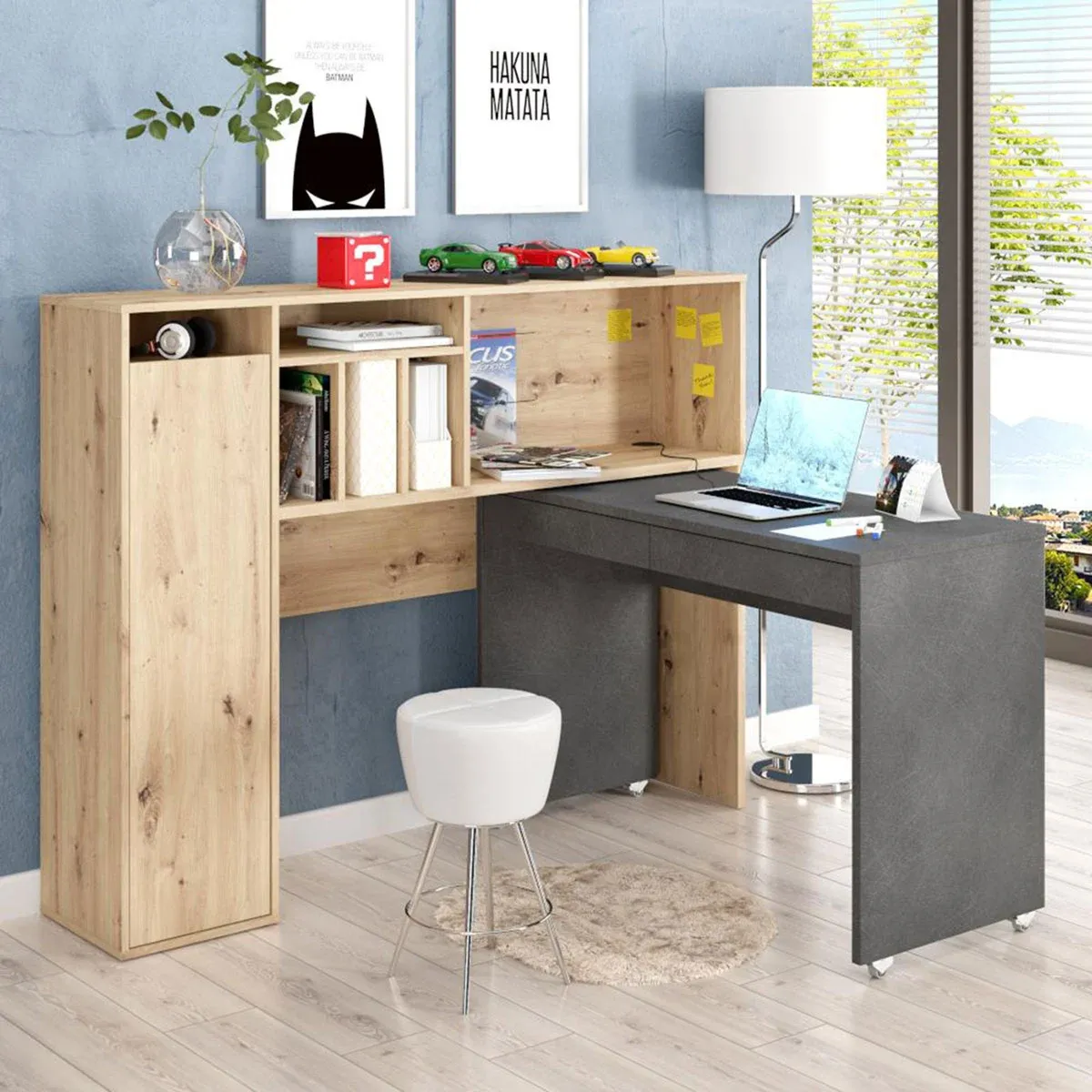Zona studio con scrivania su ruote e libreria, 154x55x119 h cm, Rovere e Ardesia