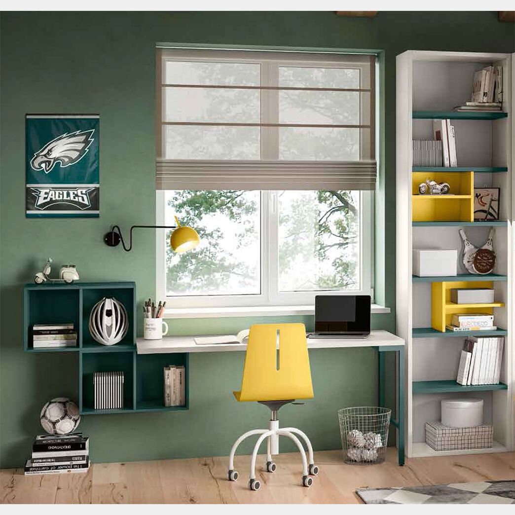 La Zona studio è pensata per offrire spazio di appoggio per libri, cartelline e documenti vari. I 4 vani a giorno in finitura Verde salvia hanno una duplice funzione, da appoggio per il piano della scrivania e da contenitori. Il piano ha una profondità di 60 cm, spazio utile per lavorare.