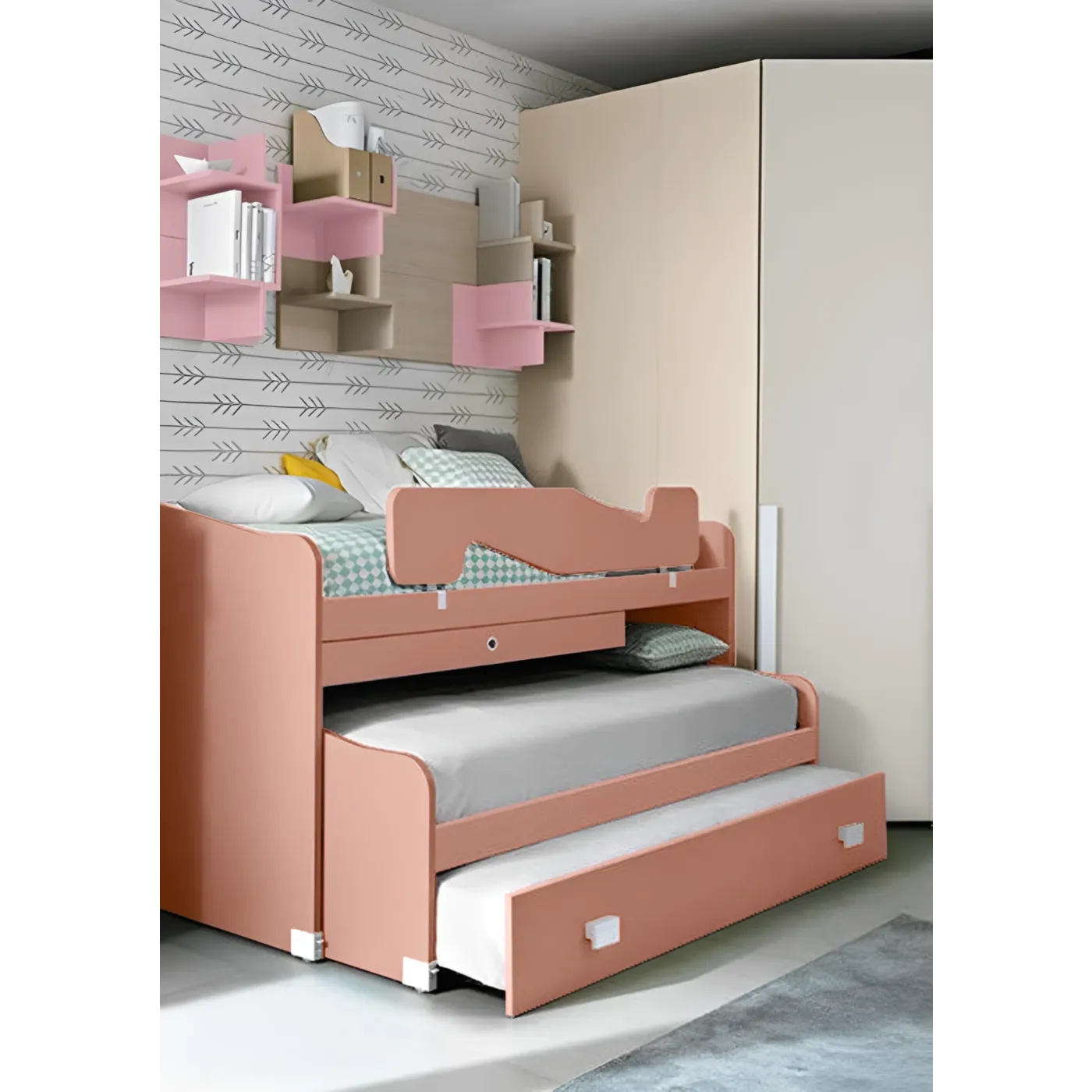 Il letto viene proposto nella finitura Rosa antico, è possibile però personalizzarlo scegliendo tra un'ampia gamma di colori. Scrivania e cassetti sono disponibili solo nella finitura Nebbia. E' possibile richiedere il cassettone al posto del terzo letto ad estrazione.